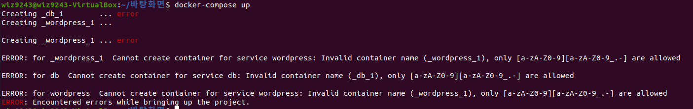 docker-compose는 현재 디렉토리를 컨테이너 이름으로 사용하는데 한글 디렉토리가 문제가 있어 보입니다.