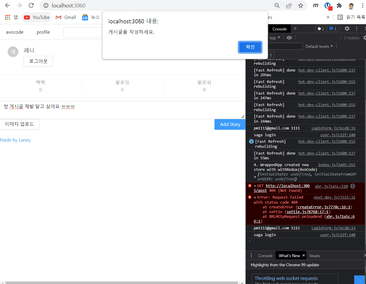 그리고 현재 게시글도 ADD_POST_REQUEST, ADD_POST_FAILURE 액션만 나오고 게시글 작성이 안되는데