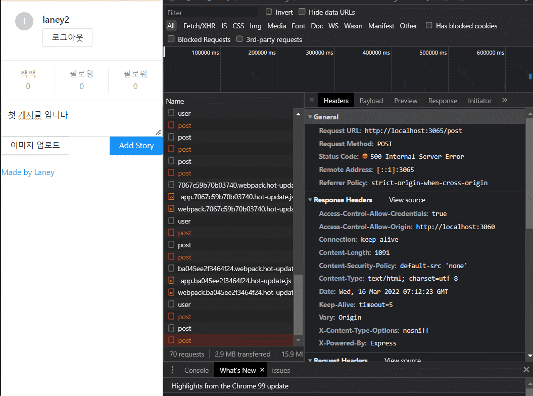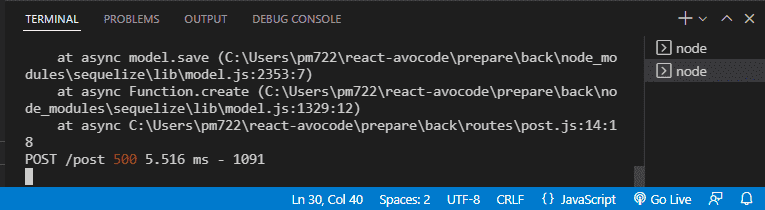 네트워크를 보니 500 Internel server error 라고 나옵니다. 이러면 routes> post.js 쪽 오류인지요?