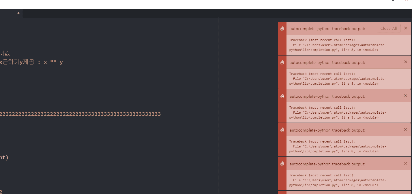 수업을 아주 잘 듣고 있는데요. 아톰에서 아래와 같이 오른쪽 부분에 오류가 계속 나는데 없앨 수 있을까요??