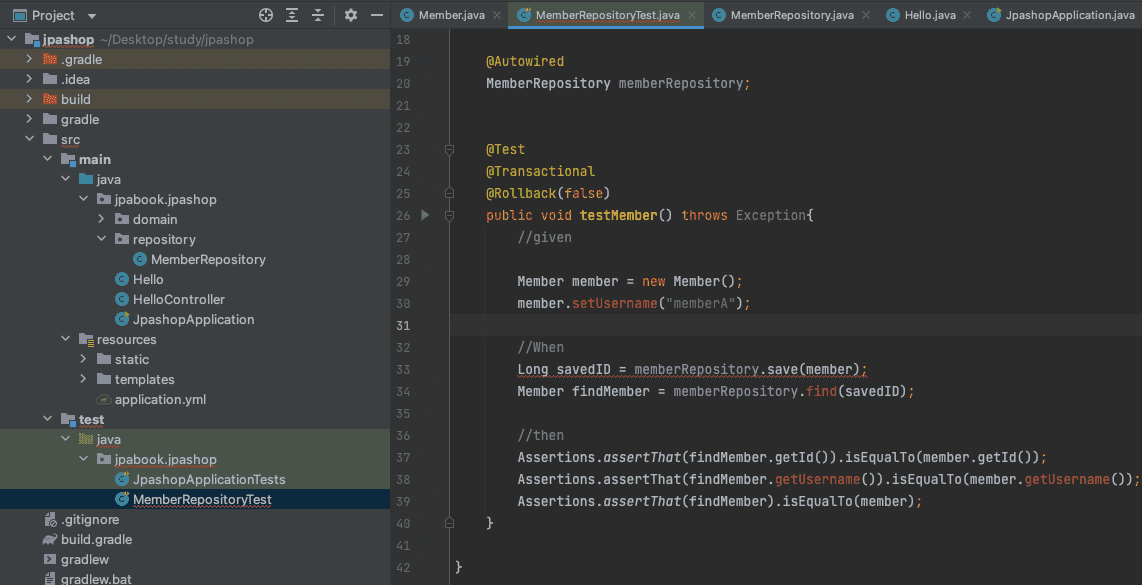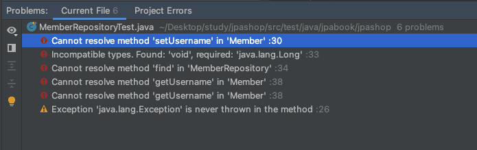 MemberRepositoryTest 의 setUsername , find, getUsername 빨간 글씨는 그대로 있습니다 ㅜㅜ