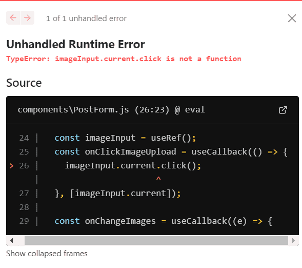 알려주신대로, imageInput.current?.click?.(); 이거로 바꾸면 버튼을 눌러도 아무런 반응이 없습니다. 콘솔창이던 네트워크던 간에 아무런 반응이 없습니다..