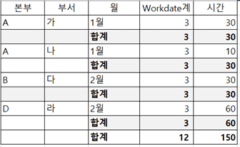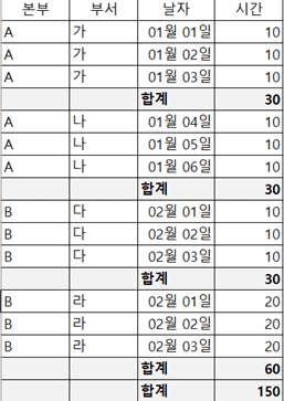 A-가를 그룹핑하되 SUM은 시간만 하는 것입니다.