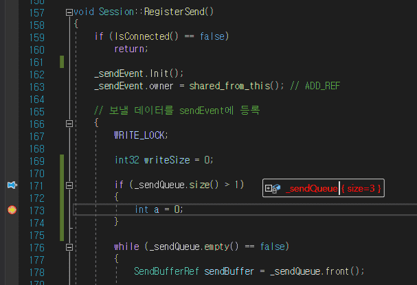 일단 send()에서 _sendQueue에 버퍼를 넣어주고 _sendRegistered를 true 변경후 RegisterSend()를 호출합니다. 그리고 _sendQueue를 모두 비운후 WSASend까지 성공을하면 send()에서 걸었던 lock이 해제가 됩니다.