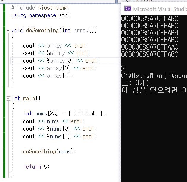 수업에서 한 doSomething함수를 적다가 궁금해서 cout<<array도 해 보았는데요, cout<<&array와 값이 다르게 나오는 이유가 뭔지 궁금합니다