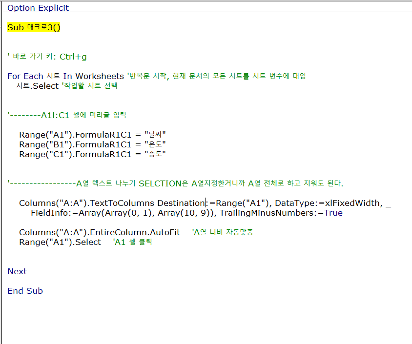 For Each 시트 In Worksheets  에서 '시트'가 변수입니다.