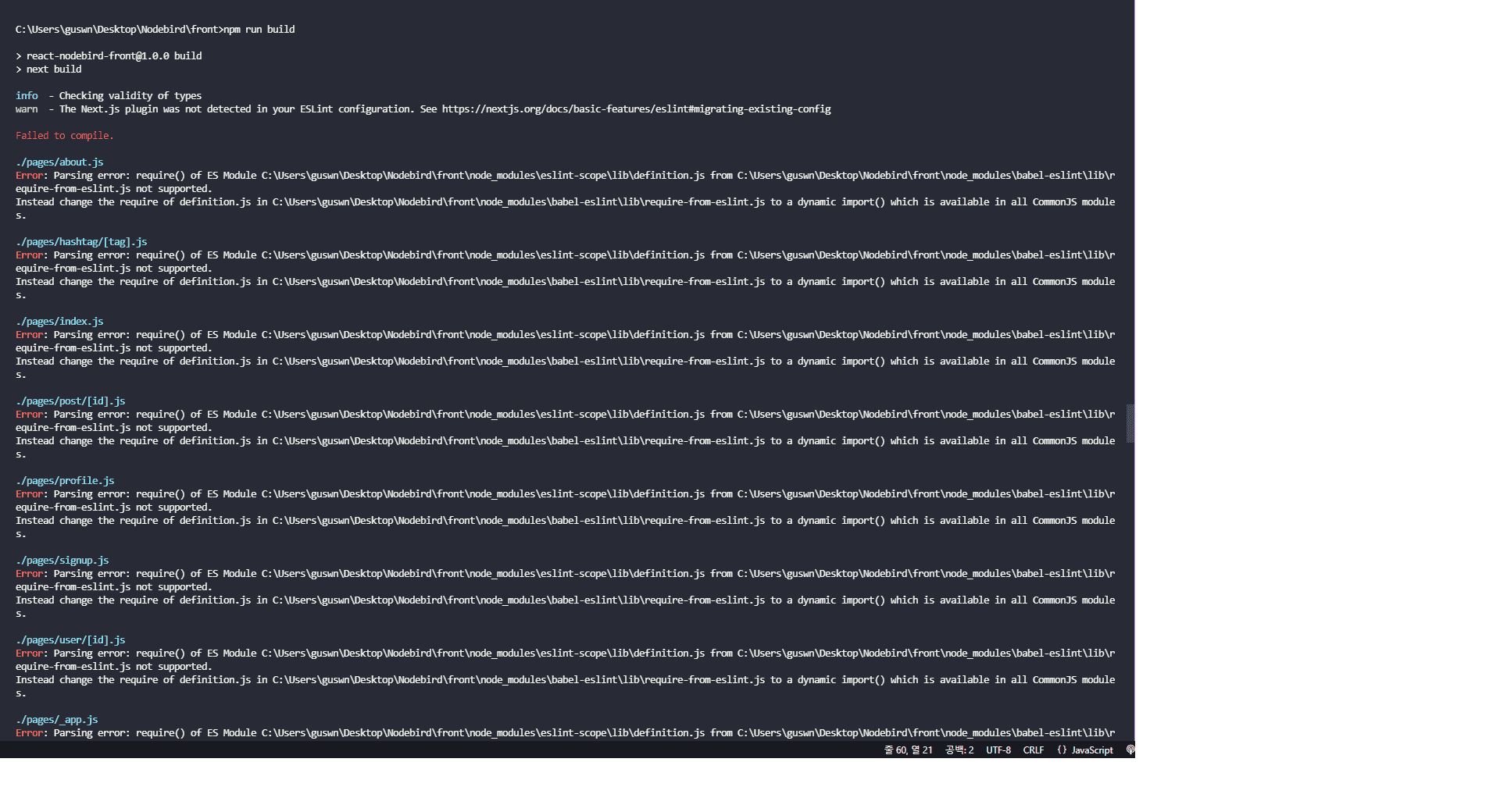 eslint 8버전에서 build시 이러한 에러들이 떳는데 eslint를 강의와 같이 7버전으로 낮추어 설치를 하니 build가 되었습니다.