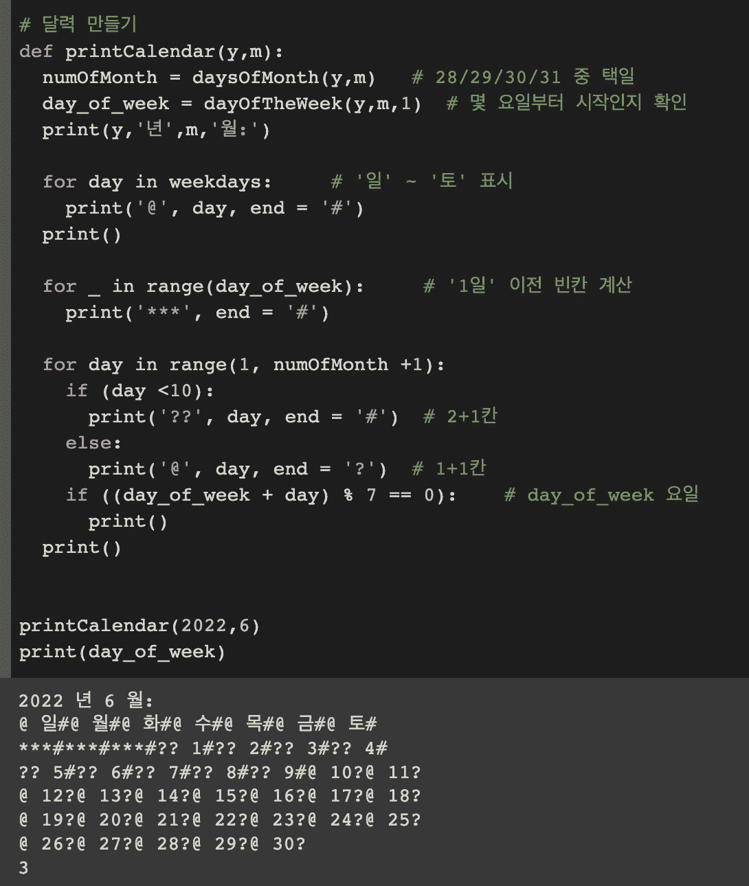 제가 확인한 바로는, 출력되는 각 값(요일, 날짜) 앞에 빈칸이 1개씩 들어가는 것을