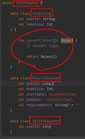 에러가 나고 있고 물론 convert func 도 걍 대충만들었습니다. 음.. 궁금한게있는데 이렇게 구현을 하면 java로 생각해보면 하나의 Dto 클래스 안에 innerclass로 crud 를 관리하는 것인데요.