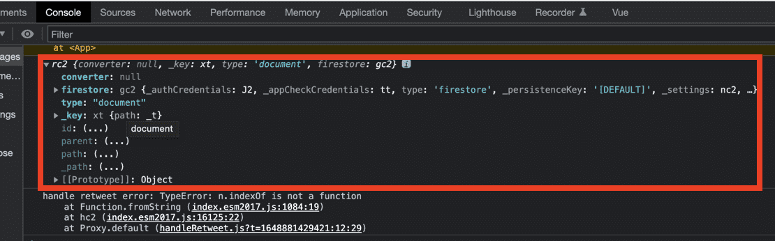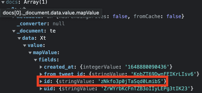 여기서부터 저는 '값을 string이 아닌 array로 불러서 type error가 발생한 것이 아닌가?'라는 생각이 들었습니다. 그래서 저는 원점으로 돌아가서 querySnapshot에서 retweet 파일의 id가 어디있는지를 찾기 시작했습니다. 결국에는 아래와 같은 위치에 있었더군요.