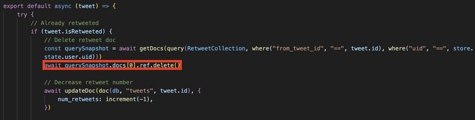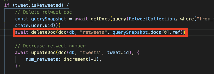 그래서 저 id를 참조해서 코드를 아래와 같이 작성하니 정상적으로 retweet이 취소되고 해당 파일도 삭제가 되었습니다.