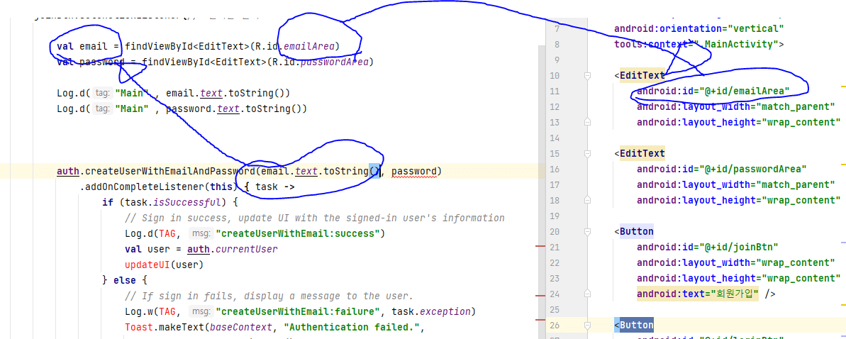 제가 생각하기론는 mainActivity.kt의 지역변수 val 의 email가 있는데 그 mainActivity.kt 의 email 변수가 findviewbyid로의 id값 emailArea를 찾아가지고 EditText의 유저가 입력한 값을 String으로 변환해서 가져온다고 생각했는데 제가 이해한게 맞을까요?? 답변 미리 감사드립니다