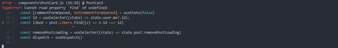 const liked 위에 console.log(post) 해보시면 에러메시지 위에 post 가 어떤 모양인지 뜰 겁니다.