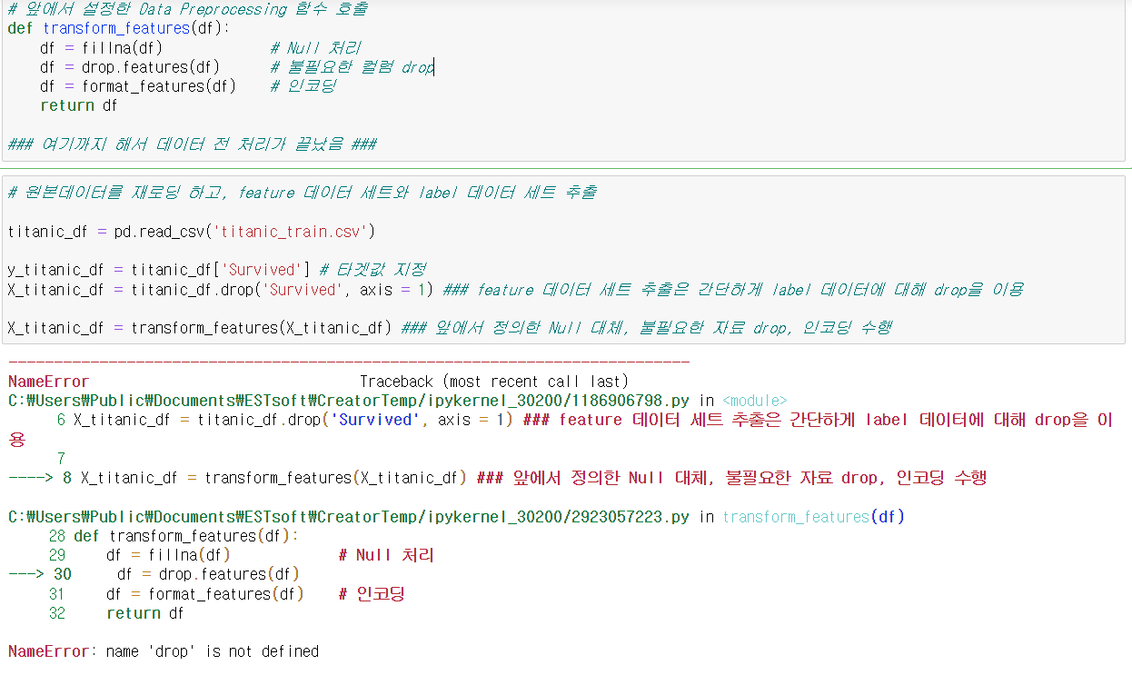 위쪽에서 def 구문을 통해 transform.features(df) 함수를 정의 했는데