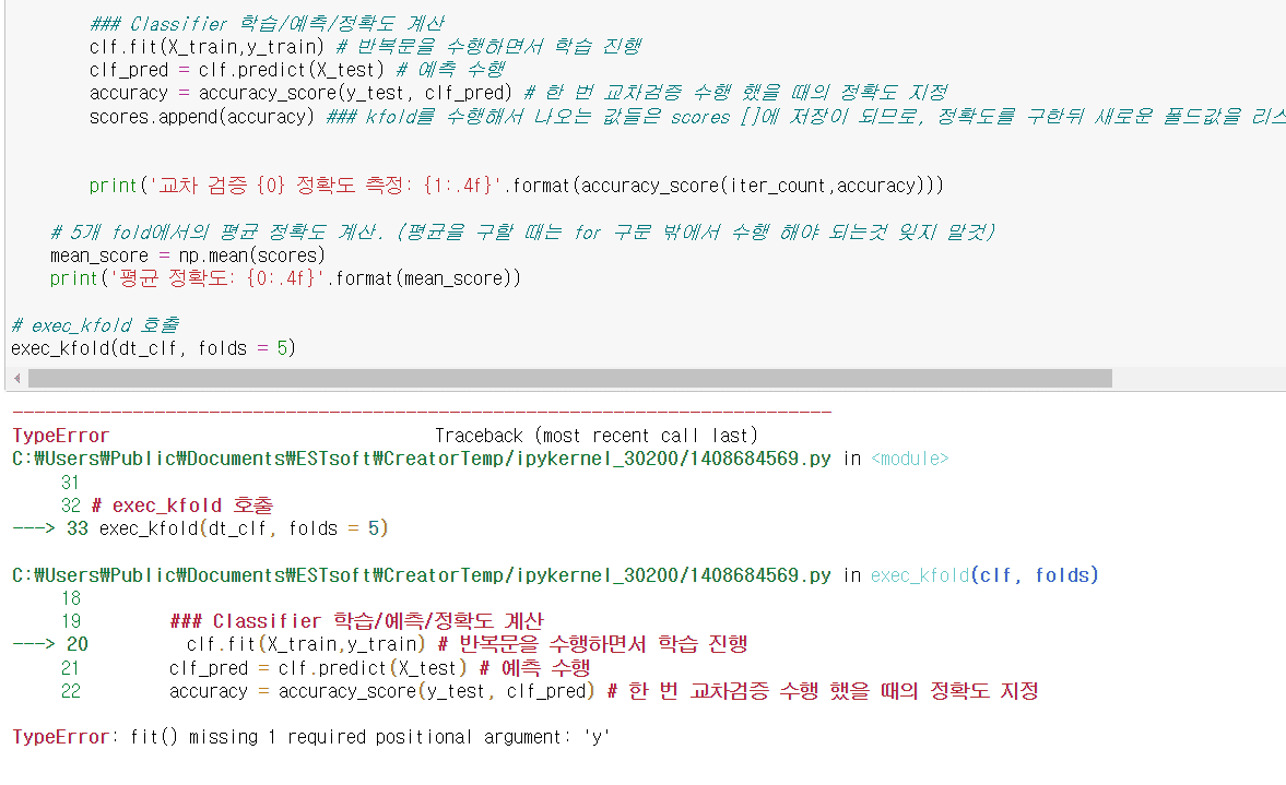 exec_kfold(dt_clf, folds =5)로 작성 되어있던데 혹시 코드가 정상적으로 작성된 것인지도 여쭤보고 싶습니다