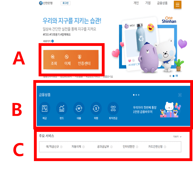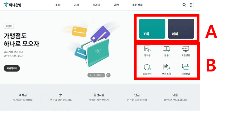 1. 하나은행 사이트는 elements를 디자인적으로 그룹화해서 비슷한 기능을 하는 그룹처럼 보이게끔은 해두었다. 하지만, 이 element들이 어떠한 topic에 의해 그룹핑이 되었는가에 대한 의문이 든다. 특히, 그룹 B는 주요 기능이라고 하기에는 직관적이지 않다고 생각이 든다. 중요한 정보를 가지고 있는 텍스트에 비해 아이콘이 상대적으로 너무 크고 화려하다. 이에 그치지 않고 심지어 텍스트는 사용자의 익숙함을 고려하지 않은 듯하다. 과연 중장년층 또는 노인이 ‘오픈뱅킹’, ‘채팅상담’ 등에 대한 단어에 익숙할까?