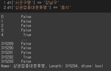 연산에 대한 결과는 True, False 로 나오며 &나 | 연산 시에도 True & False 등으로 연산하게 되면 결과가 bool 형태로 나옵니다. 여기에서 다시 데이터프레임으로 감싸면 True 인 인덱스에 해당되는 행만 가져오게 됩니다.