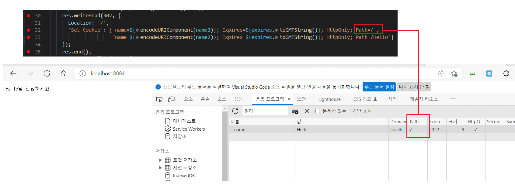 'Set-Cookie': `name=${encodeURIComponent(name2)}; Expires=${expires.toGMTString()}; HttpOnly; Path=/Hello`,