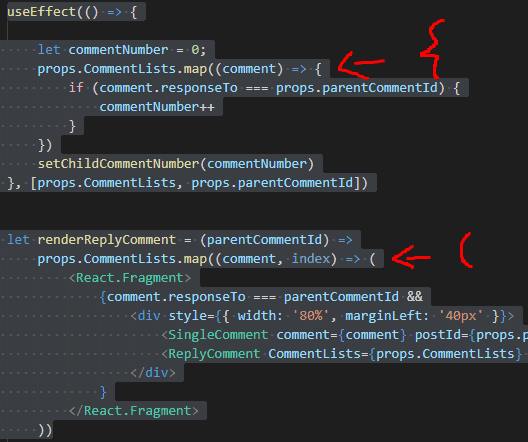 1. 아래 이미지에서 체크된부분 똑같이 map으로 루프도는코드인데요. 하나는 { 이고 하나는 ( 인데 각각 어떤경우에 써야하는건지 감이 안잡혀서 문의드립니다.