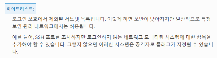 따라서 로그인 보호 정책이 적용되지 않을 화이트 리스트만 적용할 뿐 실제 접속과는 상관이 없습니다. 강의 화면에서 제가 테스트할 때는 여러번 접속해서 임시로 차단된 것 같습니다.