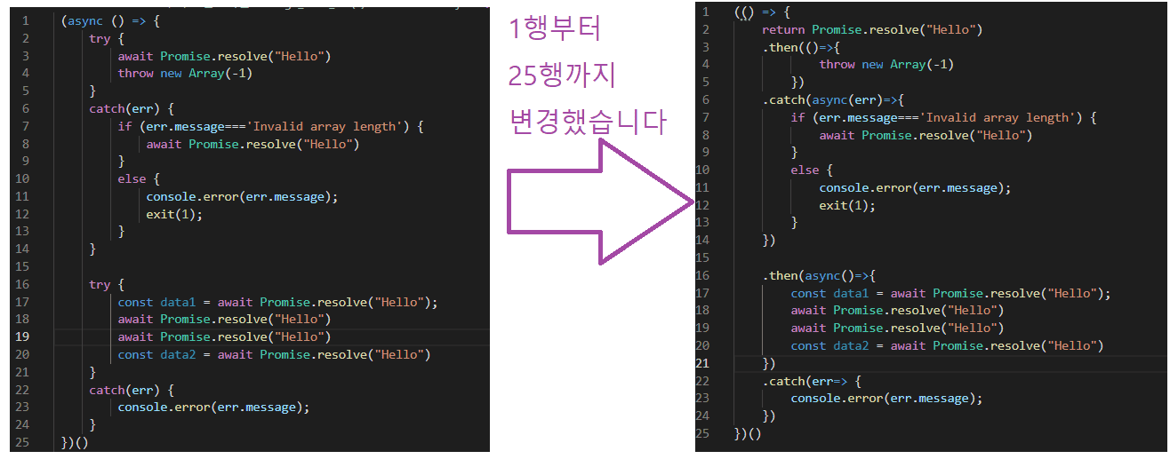 2번째 변경코드는 1행부터 25행까지 수정했습니다