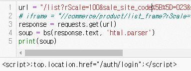 # 그 후 주소창의 url을 가져와서 테스트 삼아 파싱을 하면 위와 같은 오류가 뜹니다.