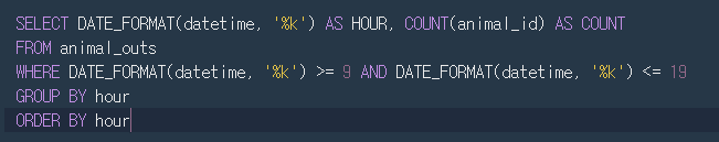 2) 1의 이유로, 유빈님이 작성하신 코드의 실행결과를 살펴보면 ORDER BY hour을 했을 때 9, 10, 11, .., 19 의 순서가 아닌 10, 11, .., 19, 9의 순서로 출력되는 것을 확인하실 수 있습니다. 이는 출력된 hour이 문자이므로 앞자리가 1인 것부터 추출되었기 때문입니다. HOUR() 함수를 사용하면 숫자로 출력되기 때문에 1,2,3 ,... 의 숫자 순서 대로 출력이 됩니다. 이 문제에서는 9, .., 19 순서 대로 출력이 되어야 하기 때문에 HOUR()함수를 써서 간단하게 작성하는 것이 좋을 것 같네요.