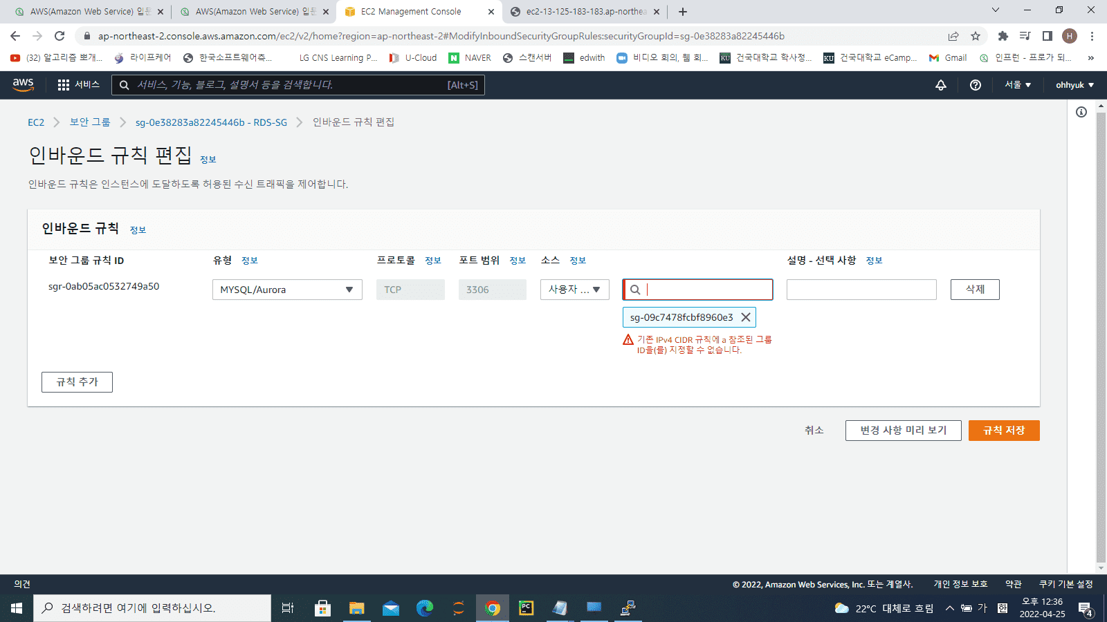 RDS 실습 중에, MySQL 연결을 위해서 강의 내용대로 RDS 인바운드의 소스를 바꾸려고 하는데, 아래와 같은 메세지가 나옵니다.