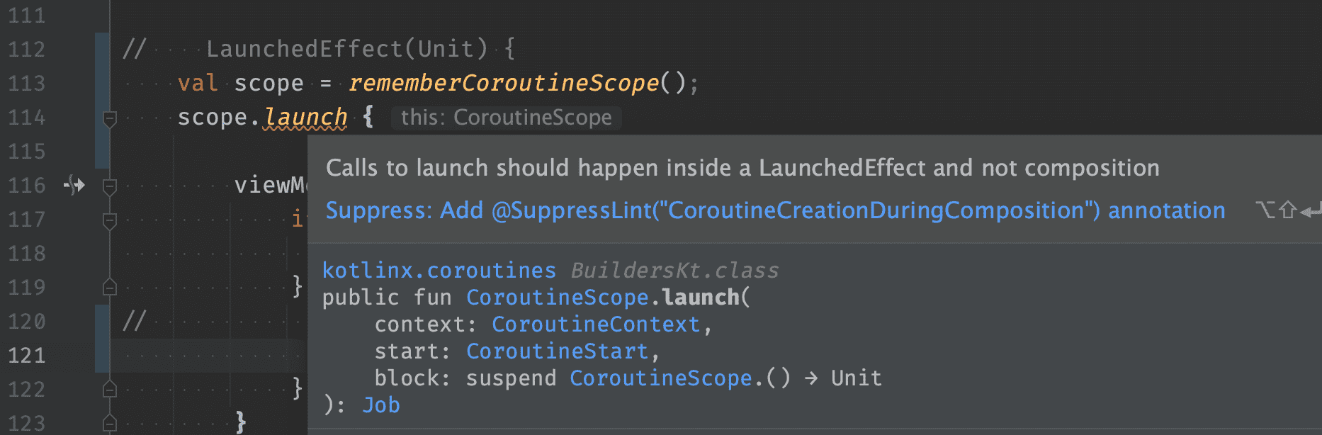 컴포저블 내부에서 코루틴을 시작해야 한다면 LaunchedEffect를 사용하도록 안내하고 있습니다.
