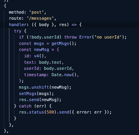 body.userId가 있는지, msgs는 제대로 가져오는지, newMsg는 정상적으로 작성되었는지 등을 출력해 보세요.