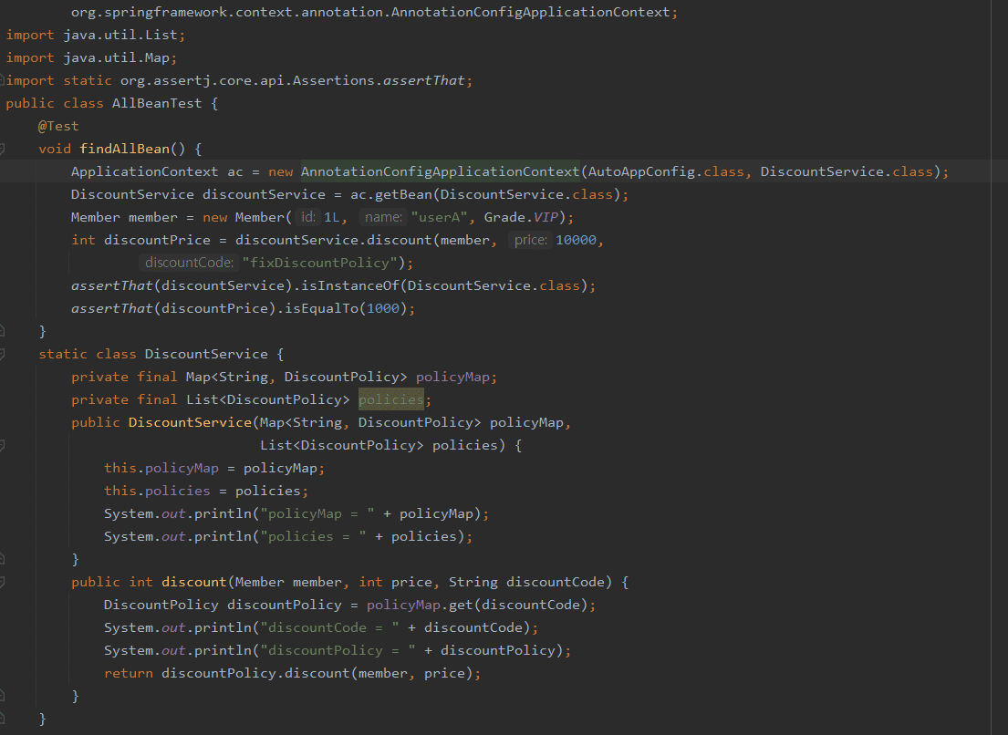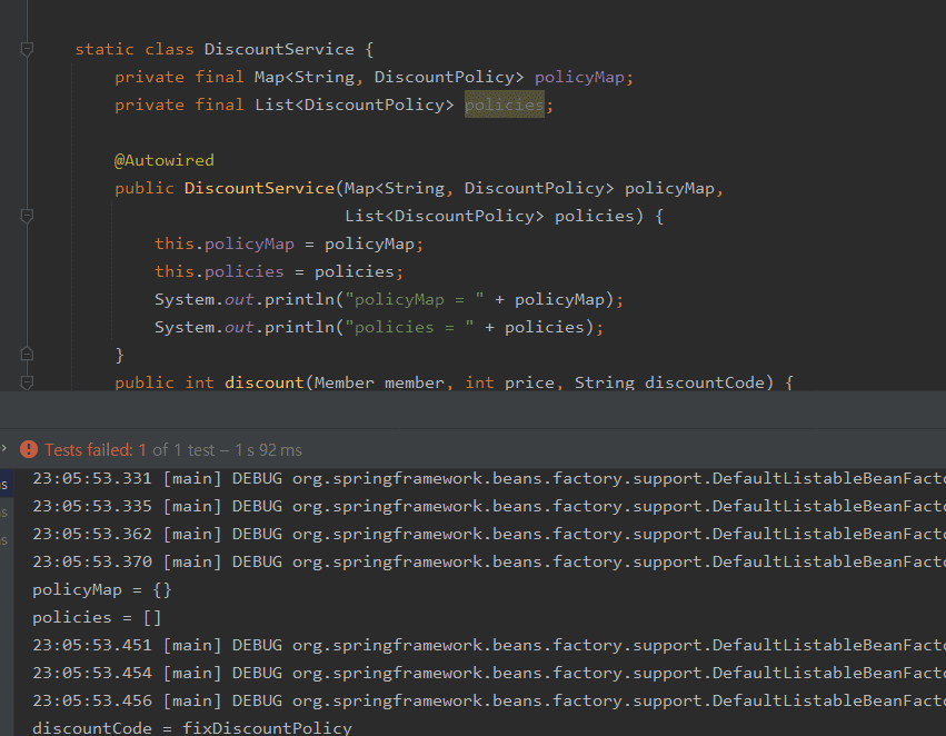 AllBeansTest 내 DiscountService 생성자 쪽에 @Autowired가 빠져있습니다.