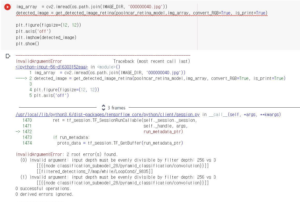 제가 올려주신 colab 주소로 실행을 해보니까 정상적으로 inference 모델로 변환도 되고  object detection도 문제없이 수행합니다.