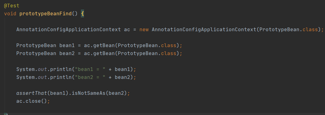 싱글톤의 경우 첫줄, 스프링 컨테이너가 매개변수로 넘어온 클래스를 스프링 빈으로 등록할 때, 빈을 생성하고 의존관계 주입까지 마칩니다. 그 증거로 PostConstruct 어노테이션이 붙은 init 메서드가 실행되죠.