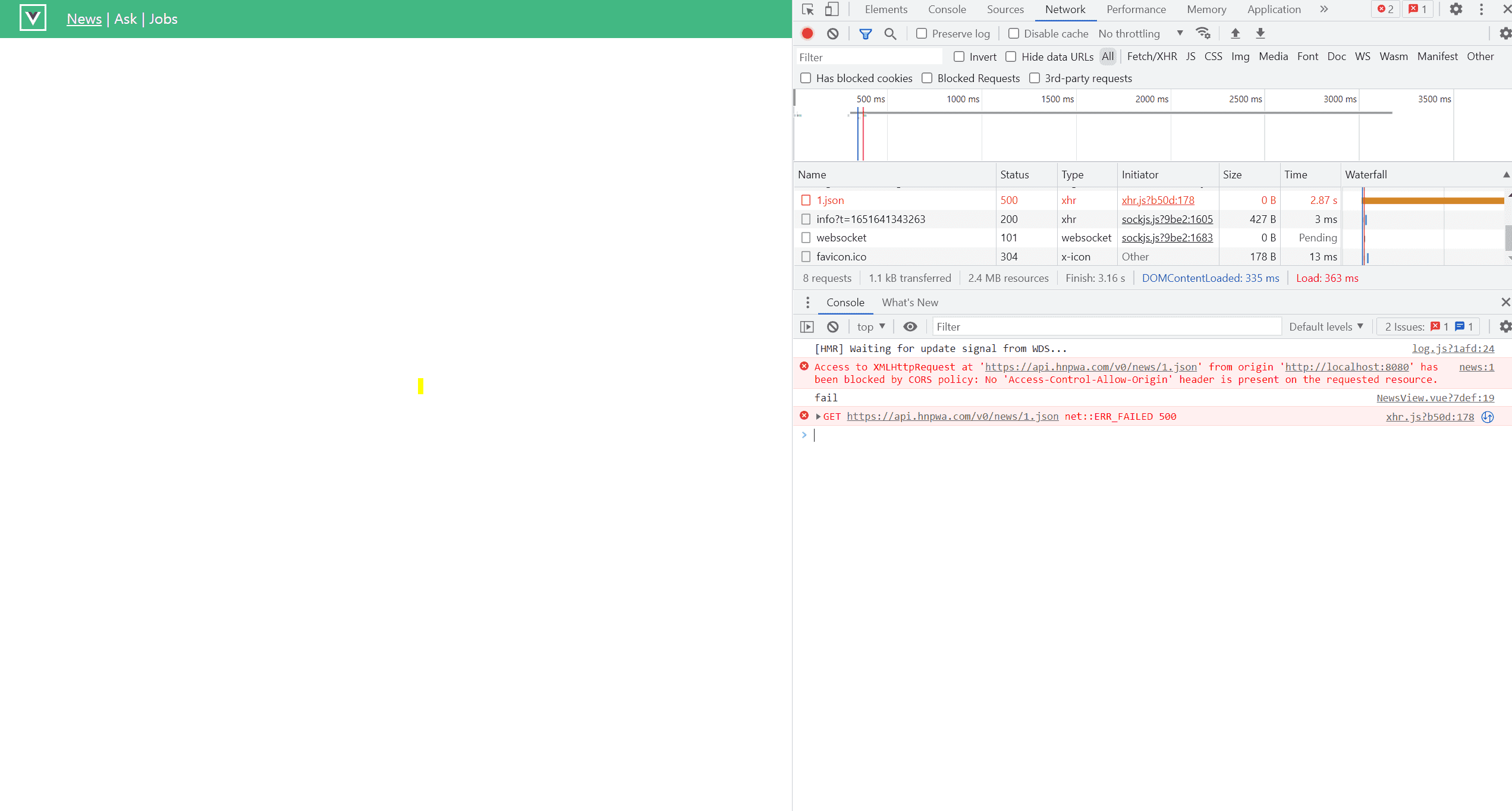 api 쪽으로 요청 하면, cors-error가 자꾸 나는데요... https://api.hnpwa.com/v0/news/1.json 여기 api로 어쩔떈 접속이 되는데 또 어쩔때는 접속이 안되네요...이거 혹시 원인이 있을까요??또 cors-error 해결하려고, 따로 config 파일 만들어서 proxy 설정을 https://api.hnpwa.com/v0 이런식으로 하고, 요청 해봤는데도 안먹히네요.... 혹시 해결 방법이 있을까요?