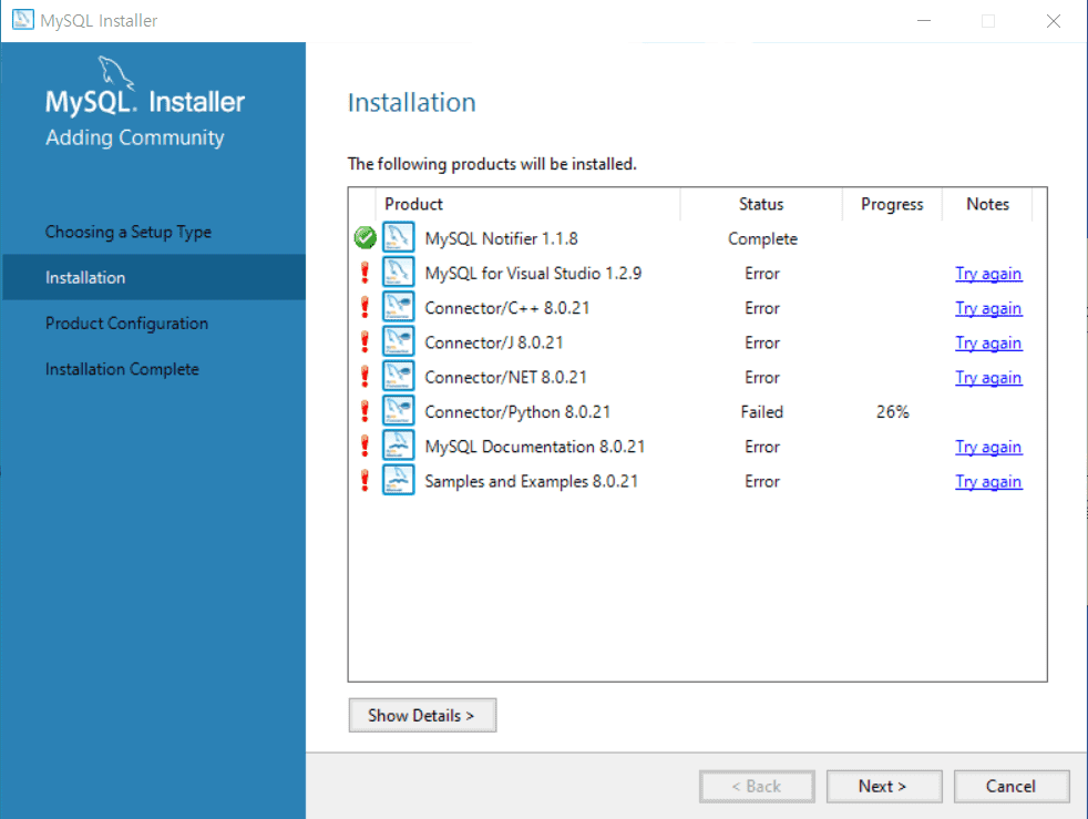 안녕하세요 원도우 MySQL 설치 과정에서 자꾸만 이렇게 에러가 뜨는데 어떻게 하면 되나요?