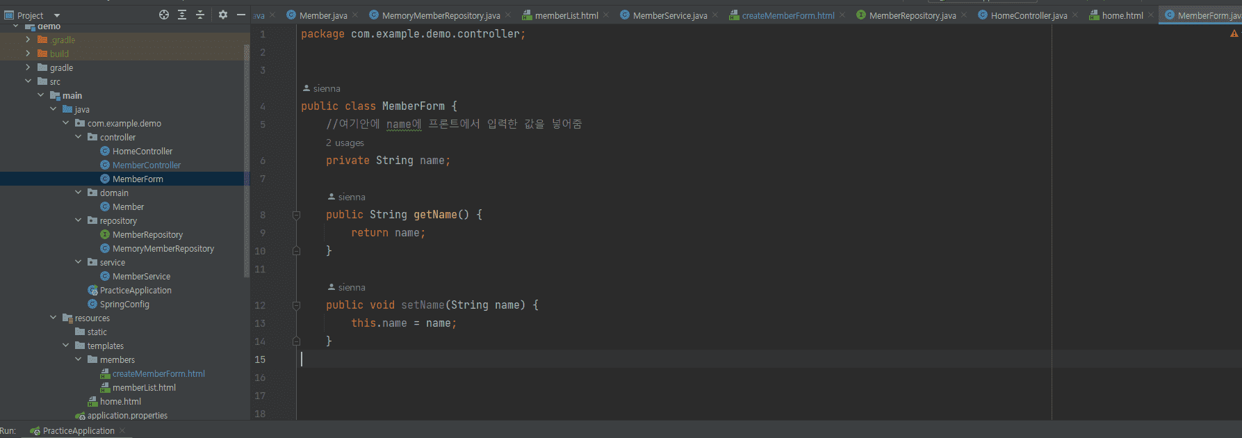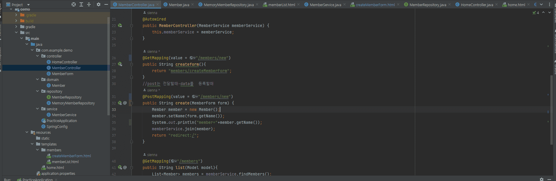 코드를 열심히 따라 치고 하고 있는데,[회원 웹 기능 -등록]강의에서 , 이름을 입력하면 그 값이 들어오고 redirect로 /로 넘어가야하는데 넘어가지 않습니다. aaa라는 이름을 넣고 등록을 누르면 사진과 같이 등록 폼 초기화가 되고 url만 바뀌는것을 볼 수 있습니다. http는 get으로 보내지는것 같습니다