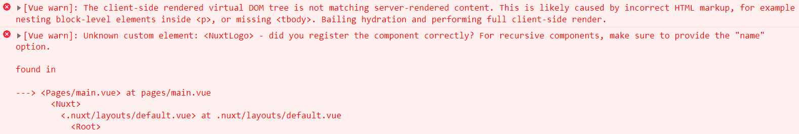 에러 로그를 보고 components/NuxtLogo.vue의 코드에 name 옵션을 추가하였으나 에러가 해결되지 않아 질문 남깁니다.