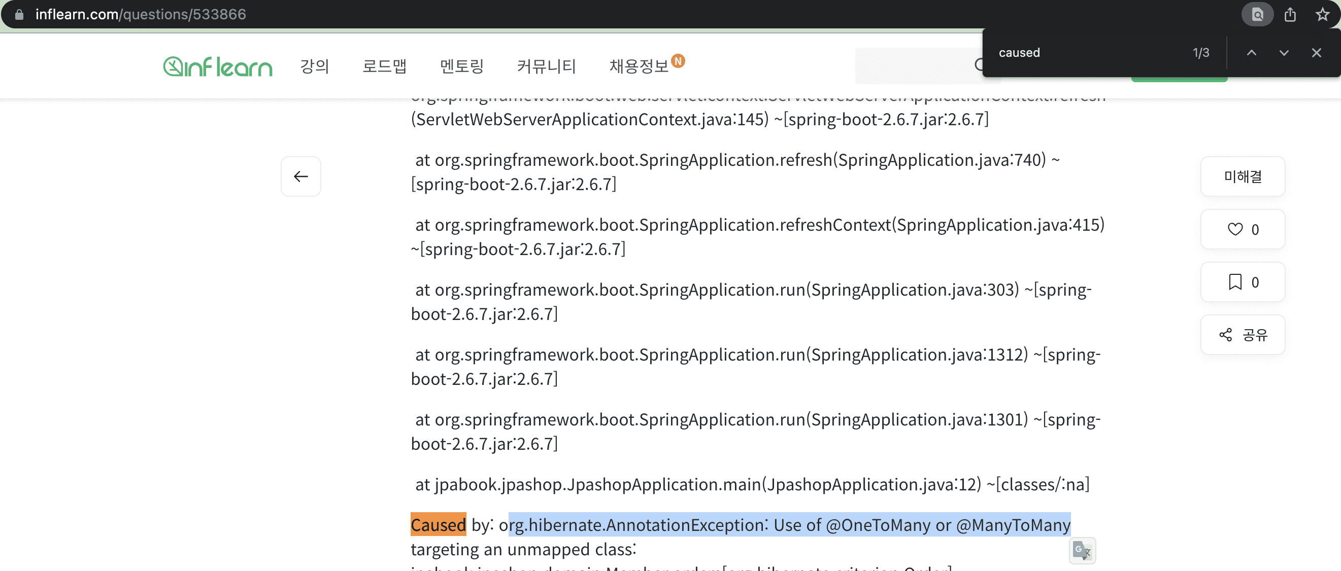 ksd2521님 질문 같은 경우에도 caused로 어떤 이유에서 에러가 발생했는지 확인하여 영한님 답변 내역을 찾아볼 수 있었습니다.