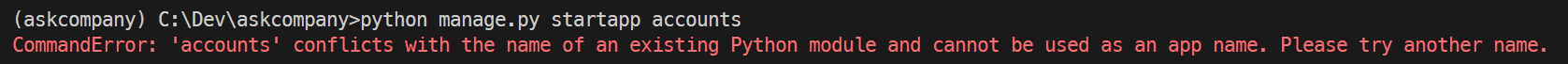 manage.py 가 있는 경로에 accounts 이름의 폴더나 파일이 있으신가? 그리고 settings.py 내의 INSTALLED_APPS 현재 내역이 어떻게 되시나요?