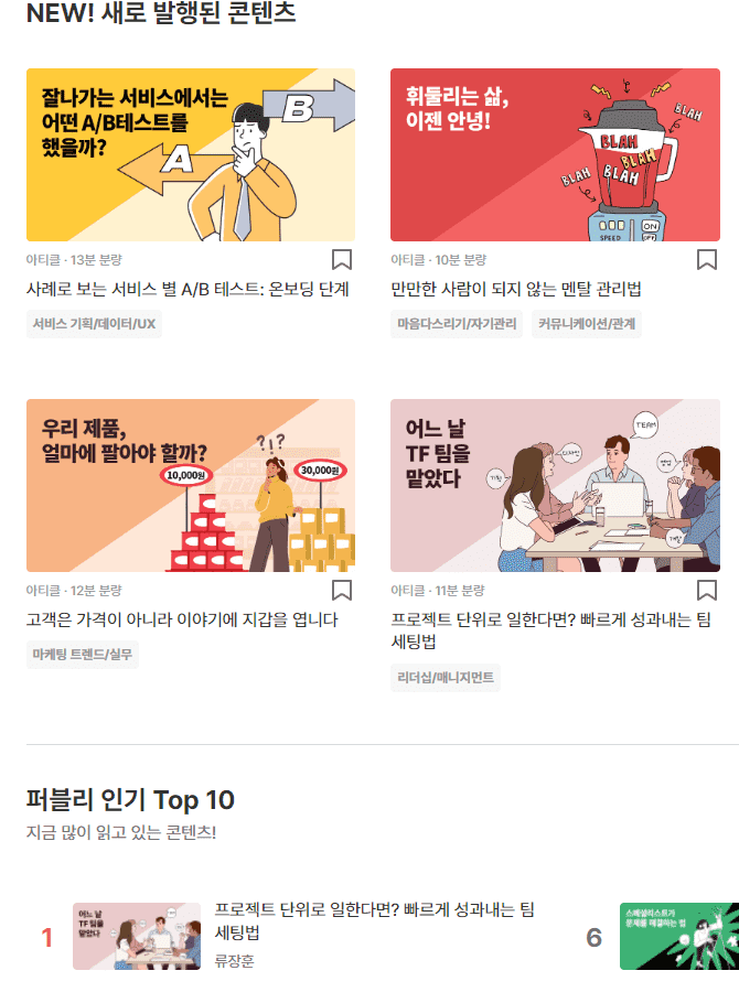 퍼블리의 일반 아티클과 인기 컨텐츠는 말씀하신대로 크기를 다르게 하여 구분이 잘 되어보이는 것 같습니다. 새로 발행된 컨텐츠를 훨씬 더 크게 한 것은 퍼블리의 비즈니스는 컨텐츠 발행에 있기 때문에 이들이 사용자에게 더 쉽고 빠르게 노출되어야 했던 것 같고 이를 잘 설계한 것 같습니다.