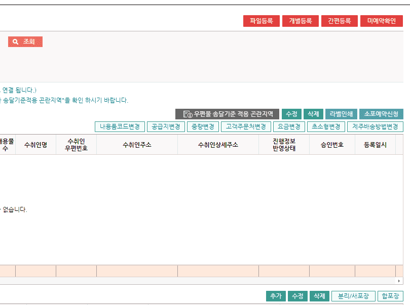가장 중요한 ‘등록’을 ‘택배 등록’ 이라는 이름으로 통일하고, 그 다음으로 중요한 ‘라벨 인쇄’를 부각하여 CTA만 개선해도 훨씬 사용하기 편한 디자인이 될 듯 합니다.