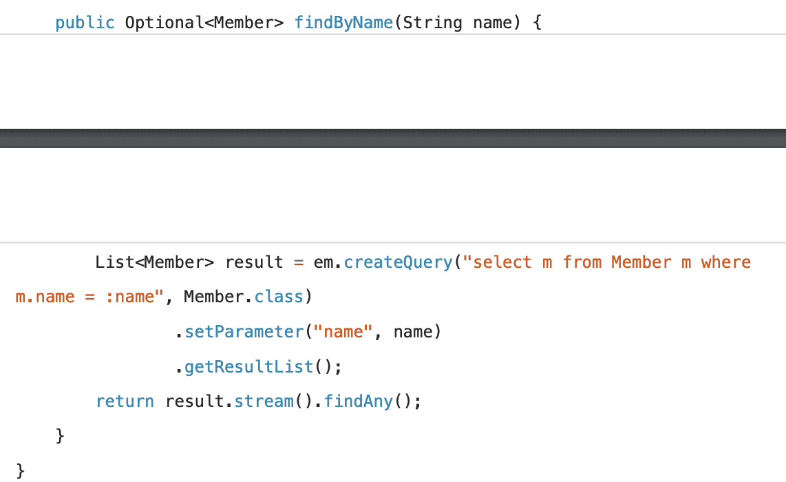 java.lang.IllegalArgumentException: Could not locate named parameter [name], expecting one of [] at org.hibernate.query.internal.ParameterMetadataImpl.getNamedParameterDescriptor(ParameterMetadataImpl.java:229) at org.hibernate.query.internal.ParameterMetadataImpl.getQueryParameter(ParameterMetadataImpl.java:198) at org.hibernate.query.internal.QueryParameterBindingsImpl.getBinding(QueryParameterBindingsImpl.java:189) at org.hibernate.query.internal.AbstractProducedQuery.setParameter(AbstractProducedQuery.java:501) at org.hibernate.query.internal.AbstractProducedQuery.setParameter(AbstractProducedQuery.java:122) at hello.hellospring.repository.JpaMemberRepository.findByName(JpaMemberRepository.java:35) at hello.hellospring.service.MemberService.validateDuplicateMember(MemberService.java:52) at hello.hellospring.service.MemberService.join(MemberService.java:44) at hello.hellospring.service.MemberService$$FastClassBySpringCGLIB$$530c61b7.invoke(<generated>) at org.springframework.cglib.proxy.MethodProxy.invoke(MethodProxy.java:218) at org.springframework.aop.framework.CglibAopProxy$CglibMethodInvocation.invokeJoinpoint(CglibAopProxy.java:783) at org.springframework.aop.framework.ReflectiveMethodInvocation.proceed(ReflectiveMethodInvocation.java:163) at org.springframework.aop.framework.CglibAopProxy$CglibMethodInvocation.proceed(CglibAopProxy.java:753) at org.springframework.transaction.interceptor.TransactionInterceptor$1.proceedWithInvocation(TransactionInterceptor.java:123) at org.springframework.transaction.interceptor.TransactionAspectSupport.invokeWithinTransaction(TransactionAspectSupport.java:388) at org.springframework.transaction.interceptor.TransactionInterceptor.invoke(TransactionInterceptor.java:119) at org.springframework.aop.framework.ReflectiveMethodInvocation.proceed(ReflectiveMethodInvocation.java:186) at org.springframework.aop.framework.CglibAopProxy$CglibMethodInvocation.proceed(CglibAopProxy.java:753) at org.springframework.aop.framework.CglibAopProxy$DynamicAdvisedInterceptor.intercept(CglibAopProxy.java:698) at hello.hellospring.service.MemberService$$EnhancerBySpringCGLIB$$6fe3e4be.join(<generated>) at hello.hellospring.service.MemberServiceIntegrationTest.회원가입(MemberServiceIntegrationTest.java:42) at java.base/jdk.internal.reflect.NativeMethodAccessorImpl.invoke0(Native Method) at java.base/jdk.internal.reflect.NativeMethodAccessorImpl.invoke(NativeMethodAccessorImpl.java:62) at java.base/jdk.internal.reflect.DelegatingMethodAccessorImpl.invoke(DelegatingMethodAccessorImpl.java:43) at java.base/java.lang.reflect.Method.invoke(Method.java:566) at org.junit.platform.commons.util.ReflectionUtils.invokeMethod(ReflectionUtils.java:725) at org.junit.jupiter.engine.execution.MethodInvocation.proceed(MethodInvocation.java:60) at org.junit.jupiter.engine.execution.InvocationInterceptorChain$ValidatingInvocation.proceed(InvocationInterceptorChain.java:131) at org.junit.jupiter.engine.extension.TimeoutExtension.intercept(TimeoutExtension.java:149) at org.junit.jupiter.engine.extension.TimeoutExtension.interceptTestableMethod(TimeoutExtension.java:140) at org.junit.jupiter.engine.extension.TimeoutExtension.interceptTestMethod(TimeoutExtension.java:84) at org.junit.jupiter.engine.execution.ExecutableInvoker$ReflectiveInterceptorCall.lambda$ofVoidMethod$0(ExecutableInvoker.java:115) at org.junit.jupiter.engine.execution.ExecutableInvoker.lambda$invoke$0(ExecutableInvoker.java:105) at org.junit.jupiter.engine.execution.InvocationInterceptorChain$InterceptedInvocation.proceed(InvocationInterceptorChain.java:106) at org.junit.jupiter.engine.execution.InvocationInterceptorChain.proceed(InvocationInterceptorChain.java:64) at org.junit.jupiter.engine.execution.InvocationInterceptorChain.chainAndInvoke(InvocationInterceptorChain.java:45) at org.junit.jupiter.engine.execution.InvocationInterceptorChain.invoke(InvocationInterceptorChain.java:37) at org.junit.jupiter.engine.execution.ExecutableInvoker.invoke(ExecutableInvoker.java:104) at org.junit.jupiter.engine.execution.ExecutableInvoker.invoke(ExecutableInvoker.java:98) at org.junit.jupiter.engine.descriptor.TestMethodTestDescriptor.lambda$invokeTestMethod$7(TestMethodTestDescriptor.java:214) at org.junit.platform.engine.support.hierarchical.ThrowableCollector.execute(ThrowableCollector.java:73) at org.junit.jupiter.engine.descriptor.TestMethodTestDescriptor.invokeTestMethod(TestMethodTestDescriptor.java:210) at org.junit.jupiter.engine.descriptor.TestMethodTestDescriptor.execute(TestMethodTestDescriptor.java:135) at org.junit.jupiter.engine.descriptor.TestMethodTestDescriptor.execute(TestMethodTestDescriptor.java:66) at org.junit.platform.engine.support.hierarchical.NodeTestTask.lambda$executeRecursively$6(NodeTestTask.java:151) at org.junit.platform.engine.support.hierarchical.ThrowableCollector.execute(ThrowableCollector.java:73) at org.junit.platform.engine.support.hierarchical.NodeTestTask.lambda$executeRecursively$8(NodeTestTask.java:141) at org.junit.platform.engine.support.hierarchical.Node.around(Node.java:137) at org.junit.platform.engine.support.hierarchical.NodeTestTask.lambda$executeRecursively$9(NodeTestTask.java:139) at org.junit.platform.engine.support.hierarchical.ThrowableCollector.execute(ThrowableCollector.java:73) at org.junit.platform.engine.support.hierarchical.NodeTestTask.executeRecursively(NodeTestTask.java:138) at org.junit.platform.engine.support.hierarchical.NodeTestTask.execute(NodeTestTask.java:95) at java.base/java.util.ArrayList.forEach(ArrayList.java:1541) at org.junit.platform.engine.support.hierarchical.SameThreadHierarchicalTestExecutorService.invokeAll(SameThreadHierarchicalTestExecutorService.java:41) at org.junit.platform.engine.support.hierarchical.NodeTestTask.lambda$executeRecursively$6(NodeTestTask.java:155) at org.junit.platform.engine.support.hierarchical.ThrowableCollector.execute(ThrowableCollector.java:73) at org.junit.platform.engine.support.hierarchical.NodeTestTask.lambda$ex