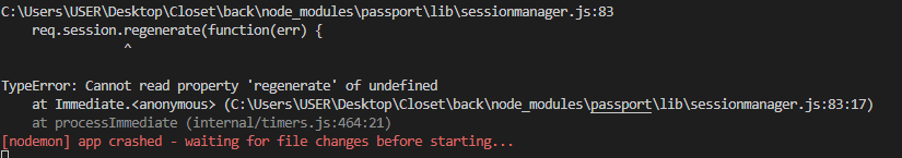 req.session.regenerate() 이건 세션을 다시 재생성해주는 함수같은데요 사용하지도않는데.. 오류가 뜨네요.. 그리고 regenerate of undefined는 session이 undefined라서 뜨는 오류라고 이해하고있는데 왜 사용하지도않는 함수에서 갑자기 undefined가 뜨는지.. session이 undefined니까 if(req.session) session이 있을때만 처리하라고 작성해도 안되네요 ㅠㅠ...