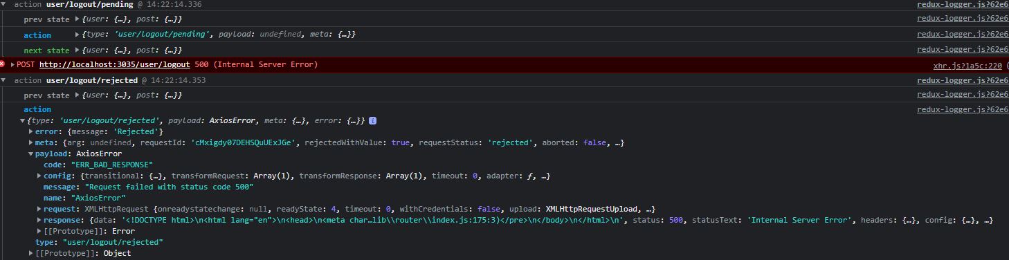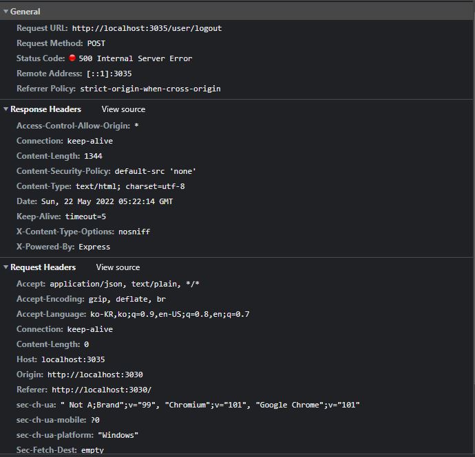 passport로 login까지는 성공하였고 logout에서 서버에서 에러가나는데요 에러내용은