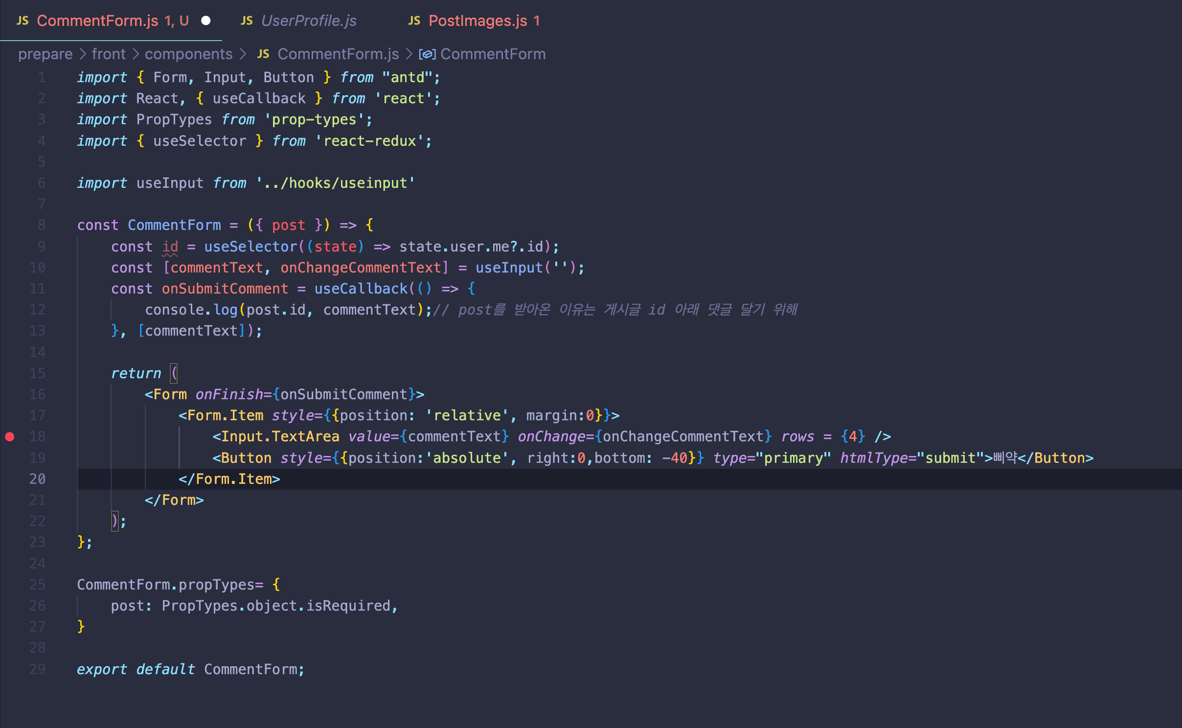 CommentForm.js에서 id값이 읽히지 않는다고 하네요..