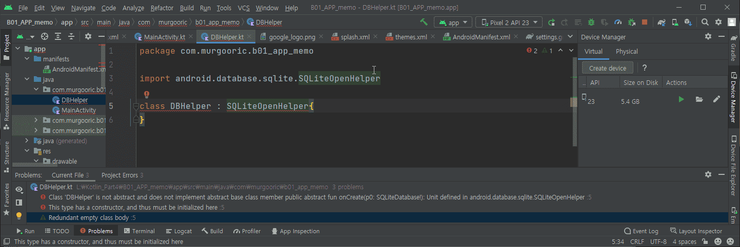 [9강] DBHelper 클래스를 추가시 오류 발생 이유 좀 알려면 감사하겠습니다.