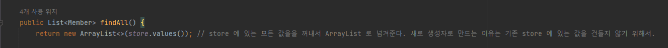 요약해서 말씀드리면 변경 가능성 때문에 재생성해주고 있습니다. findAll을 할 때 store 자체를 가져오게 되면 findAll로 가져온 리스트를 변경하면 store의 값도 변경될 수 있습니다. 그런 것을 방지하기 위해 다른 주소값을 가진 리스트 객체로 복사해서 store가 예기치 못하게 변경되는 것을 막아줍니다.