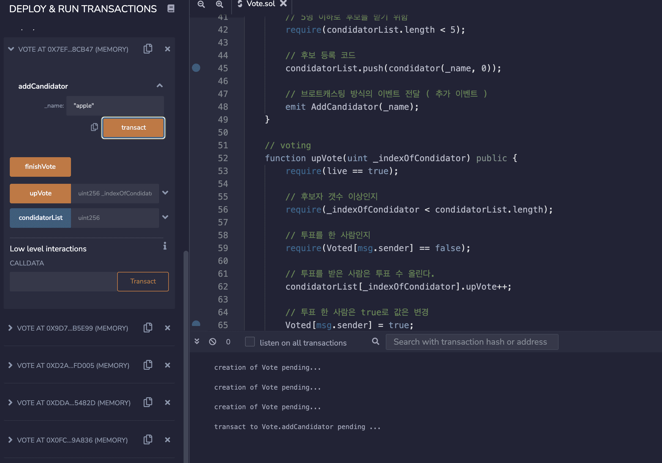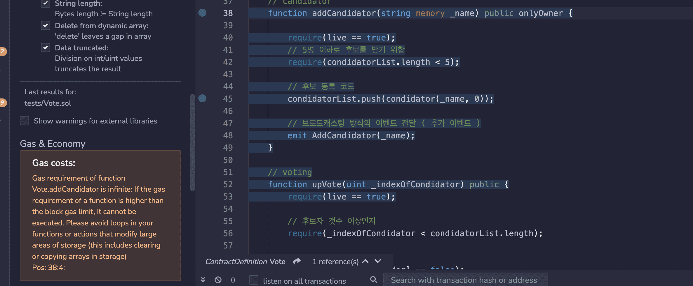 Gas requirement of function Vote.addCandidator is infinite: If the gas requirement of a function is higher than the block gas limit, it cannot be executed. Please avoid loops in your functions or actions that modify large areas of storage (this includes clearing or copying arrays in storage) Pos: 38:4: