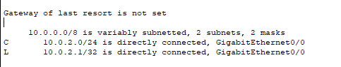 L 10.0.2.1/32는 아이피 주소가 10.0.2.1인 라우터 주소를 가리키고 C 10.0.2.0/24는 지정한 네트워크 대역대를 라우팅 하게 됩니다.