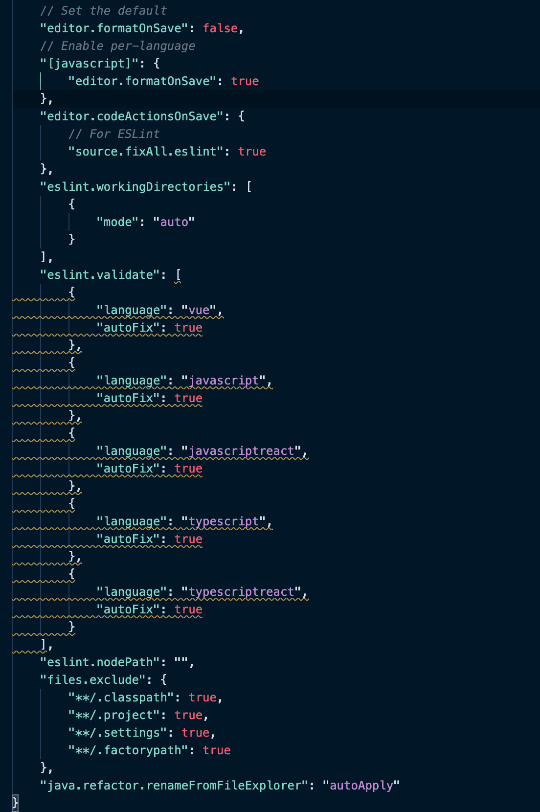 안녕하세요 edu1님, 아마 VSCode에서 Beautify나 Prettier의 포매터(Formatter) 플러그인을 사용하고 계실 것 같은데요. ESLint에서 모든 코드를 정리할 수 있도록 다른 포매터 플러그인은 꺼주시면 될 것 같습니다 :)